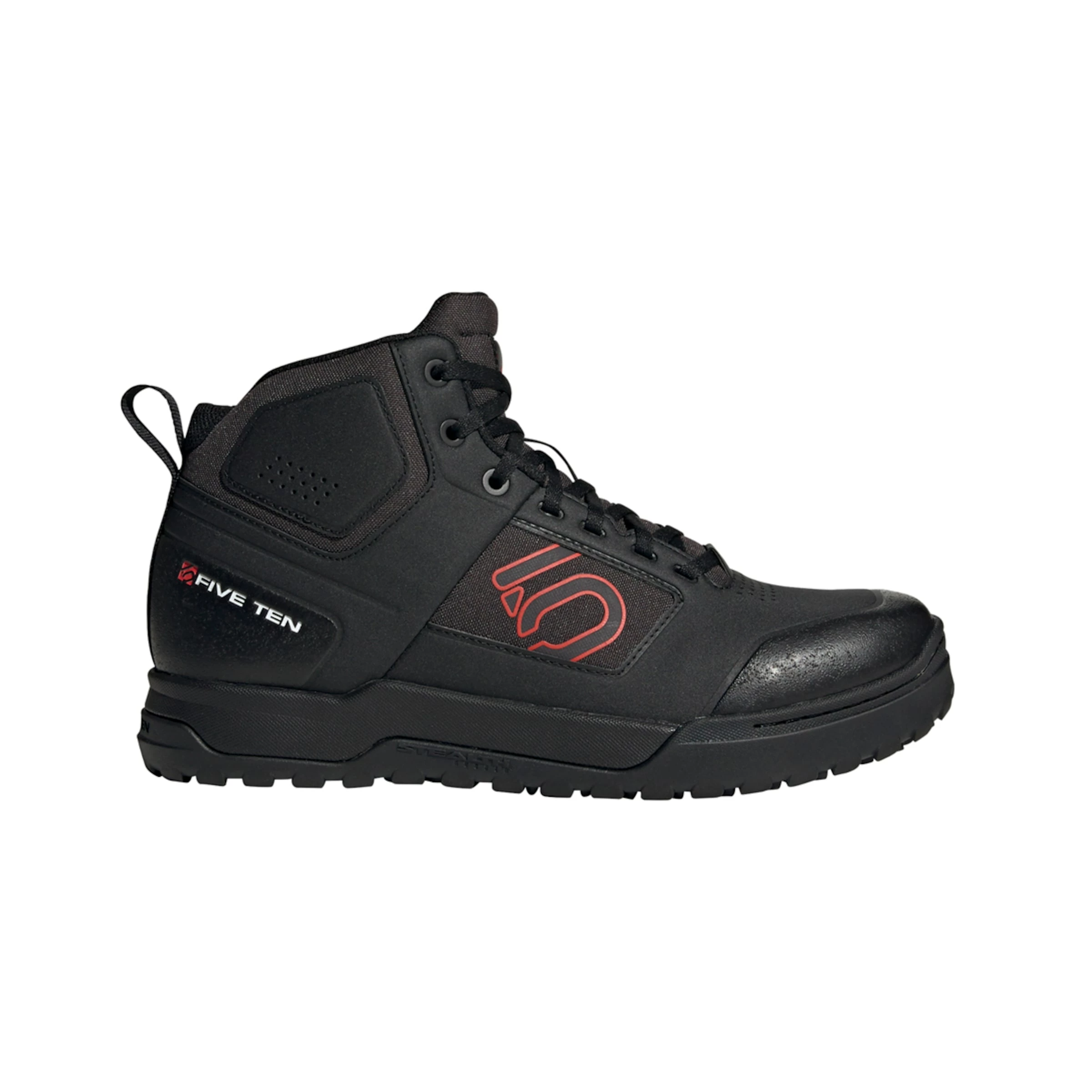 Les chaussures de vtt IMPACT PRO MID mi-hautes de chez Five Ten sont destinées aux balades d’enduro et de DH. La partie relevée à la cheville confère un plus grand maintien et empêche les saletés de parvenir à l’intérieur. La semelle extérieure Stealth S1 Dotty est adaptée selon les trails exigeants et la demande d’avoir assez de grip sur les pédales par temps de pluie et dans la boue. La matière de dessus sèche rapidement et est très agréable.
